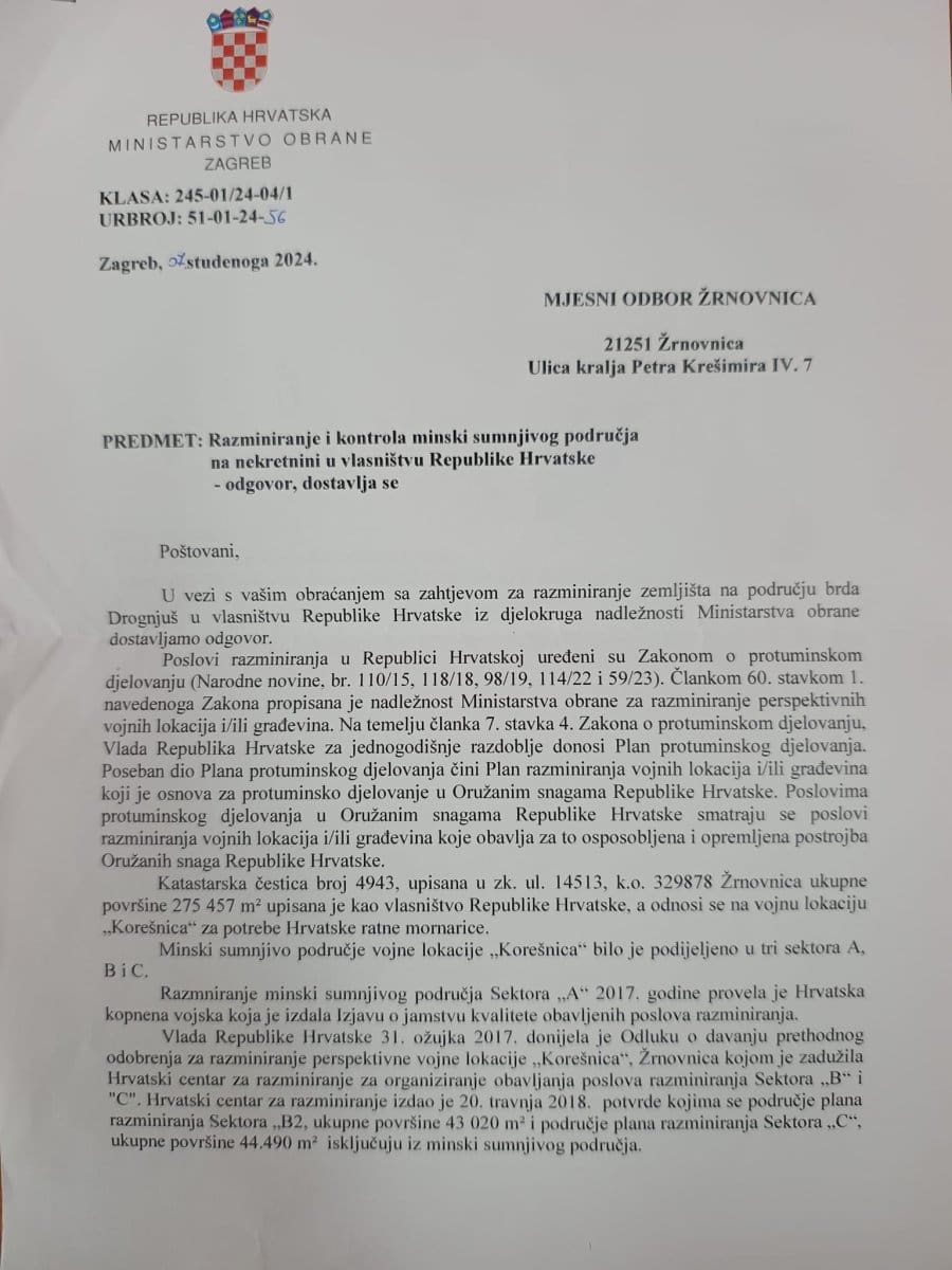 U vezi s vašim obraćanjem sa zahtjevom za razminiranje zemljišta na području brda Drognjuš u vlasništvu Republike Hrvatske iz djelokruga nadležnosti Ministarstva obrane dostavljamo odgovor.