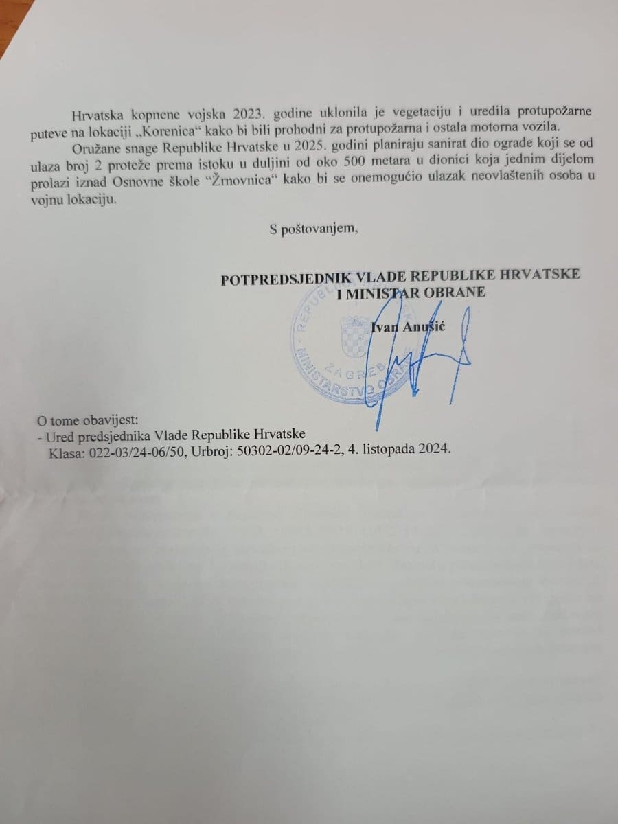 Razgovarali smo s predsjednikom MO Žrnovnica Mariom Lolićem. Mjesni odbor slao je upite vezano uz ovaj problem MORH-u, a u odgovoru koji su dobili stajalo je samo koliko puta se to područje razminiralo, kao i da će se sanirati ograda.