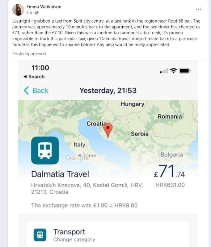"Vožnja je trajala nekih desetak minuta do našeg apartmana, a taksist nam je naplatio 71 funtu umjesto 7,10 funta. S obzirom da je riječ o nasumičnom taksiju koji se tamo nalazio, nemoguće mu je ući u trag", napisala je n Emma u Facebook grupi "Split Croatia Travel 2022". Upitala je članove grupe jesu li imali sličnih iskustava.