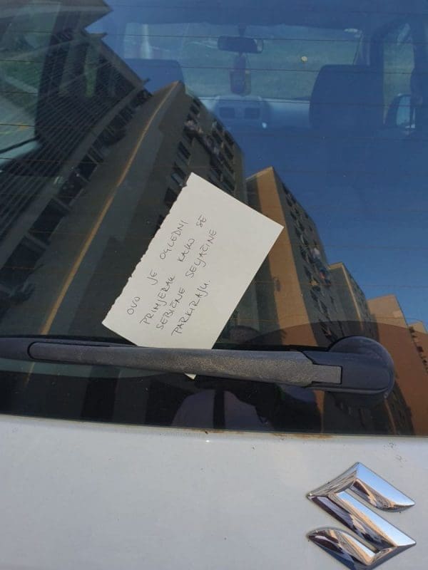 Kako očito nisu vidjeli drugi način, stanovnici koji su prisilno 'ostali bez automobila' neodgovornom građaninu su odlučili ostaviti poruku.