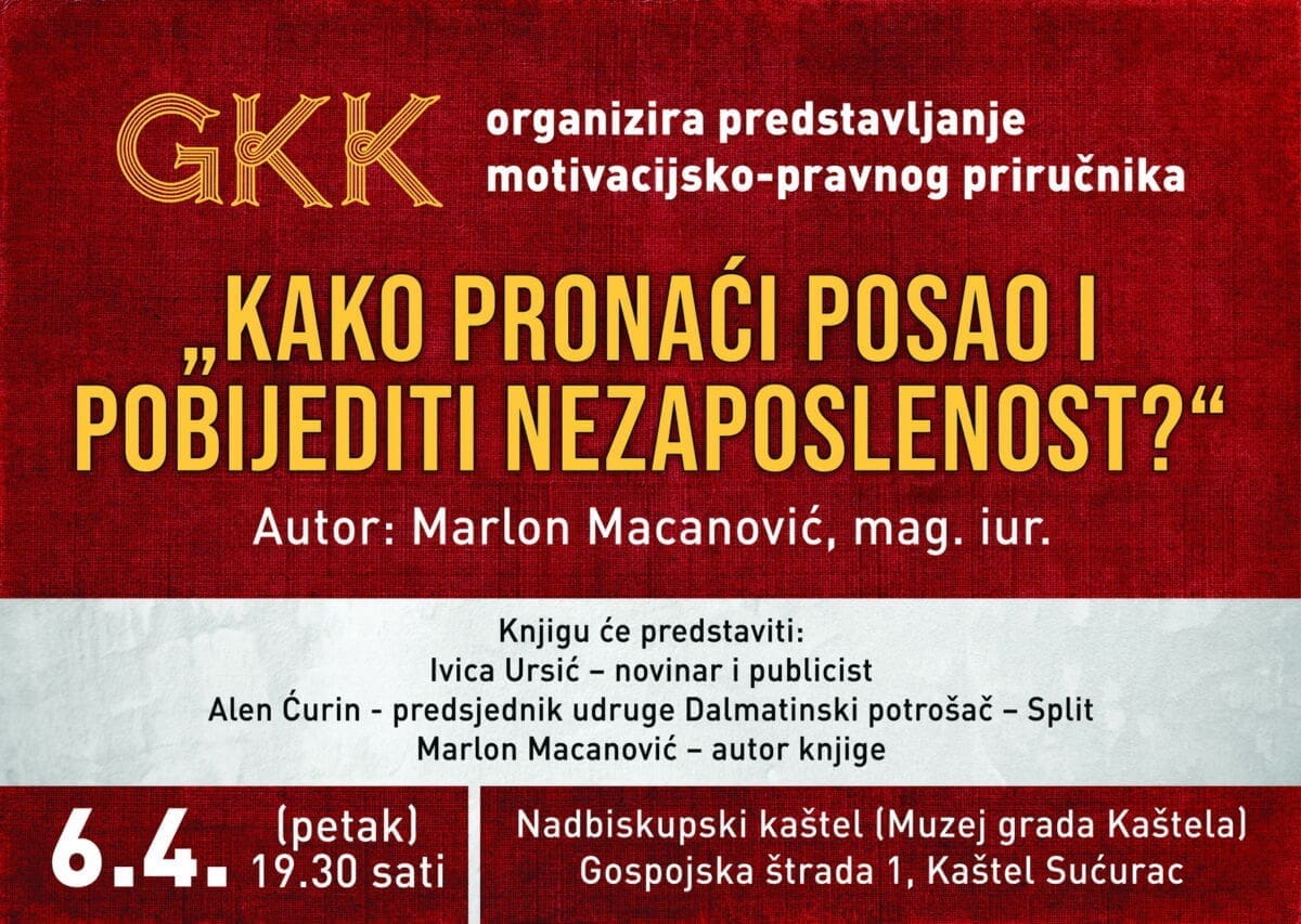 Autor motivacijsko-pravnog priručnika „Kako pronaći posao i pobijediti nezaposlenost?“ Marlon Macanović govorit će o načinu pobjeđivanja nezaposlenosti i načinu traženja posla u sklopu predstavljanja knjige u petak 6. travnja u 19.30 sati u Nadbiskupskom kaštelu (Muzej grada Kaštela) u Kaštel Sućurcu, na adresi Gospojska štrada 1.