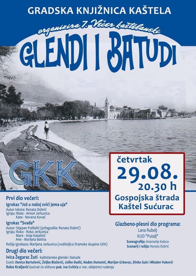 Sedmu Večer kaštelanski’ glendi i batudi, Gradska knjižnica Kaštela i ove godine organizira u sklopu Kaštelanskog kulturnog ljeta u četvrtak 29. kolovoza u 20:30 sati u Gospojskoj štradi u Kaštel Sućurcu.