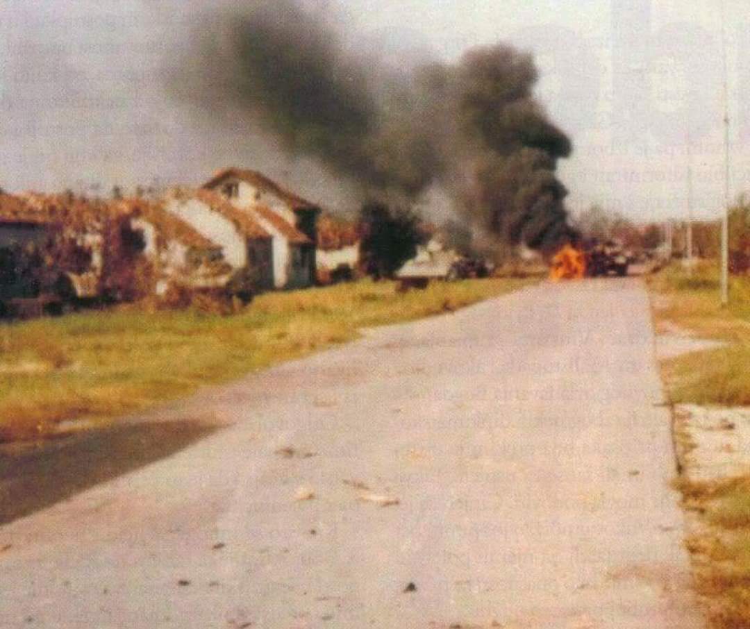 Kad su prošli raskrižje Trpinjske, Bosanske i Slavonske većina se zaustavila, a jedna 55-ica kretala se Trpinjskom prema štabu, mjesnoj zajednici i Mustangu s druge strane. Onda je netko opalio i pogodio Krnjom tenk. Krnjo je inače, mali brdski top. Bio je postavljen na parkiralištu ispred Mustanga i uperen u smjeru Osijeka tj. na raskrižje Trpinjska, Slavonska, Bosanska. Opaljivao je potezanjem užeta iz dvorišta Mustanga!