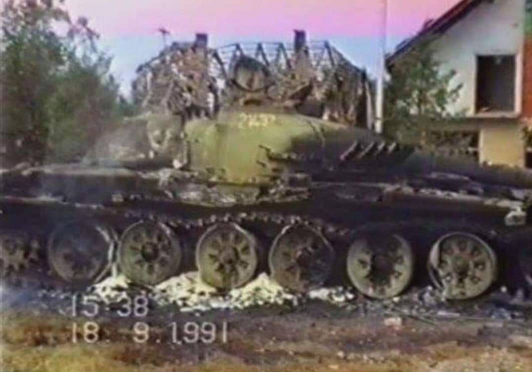 Viče on: „Pomozite, ranjen sam.“ Nisam ni skužio je li ranjen ili je tenk pucao u kuću pa ga je nešto drugo ozlijedilo, ali smo ga jedva izvukli vani u dvorište. Beba je poginuo 10. rujna 1992. godine na Kupresu. I sad čekamo taj tenk, on opet proviri, pa se vrati i tako par puta s cijevi okrenutom prema Trpinjskoj. To nama sve odgovara i dogovor pada da će ga momak iz Slavonskog Broda gađati RPG kad proviri. Kad smo se namjestili tenk proviruje više nego dosad s cijevi okrenutom prema nama. Jao koja panika cijev nas gleda s 15-20 metara i još tada počinje pucati s njega onaj 12. srpnja probija zid i to kad krenu rasprskavajući meci opća opasnost. Jedan takav je pogodio Mrđu Marinka u nogu. Svi smo se zaledili, momak je bacio RPG, nešto je puklo dali tenk, bomba ili naš RPG i Cina je teško pogođen u nogu koja se nije mogla spasiti.