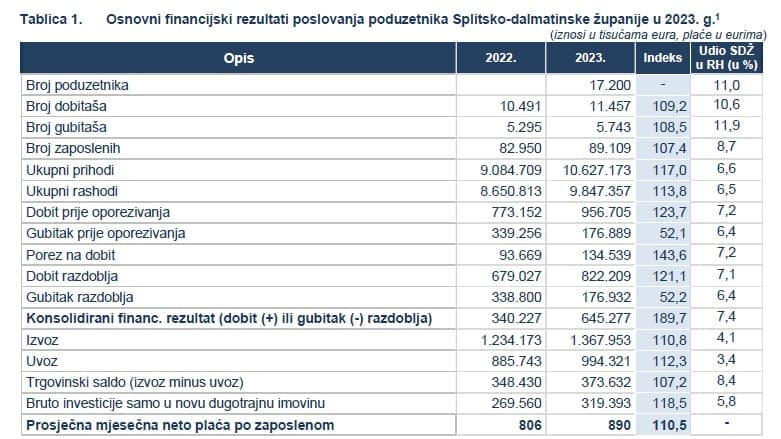 U 2023. godini, poduzetnici Splitsko-dalmatinske županije zabilježili su iznimno pozitivne financijske rezultate, unatoč izazovima koji su obilježili gospodarsko okruženje. Prema podacima FINA-e, broj poduzetnika u županiji iznosio je 17.200, dok je broj zaposlenih dosegao 89.109, što predstavlja rast od 7,4% u odnosu na prethodnu godinu.