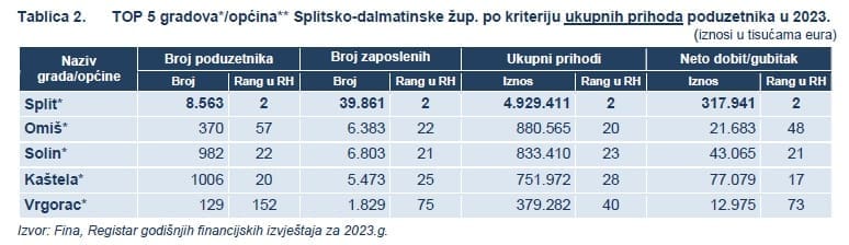 Među poduzetnicima s najvećim prihodima, STUDENAC d.o.o. iz Omiša prednjači s ukupnim prihodima od 659,1 milijun eura, dok je najveću dobit ostvarila tvrtka CEMEX HRVATSKA d.d. iz Kaštel Sućurca, sa 35,1 milijun eura dobiti. Na razini gradova i općina, Split se ističe s najvećim brojem poduzetnika (8.563), zaposlenih (39.861), kao i ukupnim prihodima od 4,9 milijardi eura te neto dobiti od 317,9 milijuna eura.