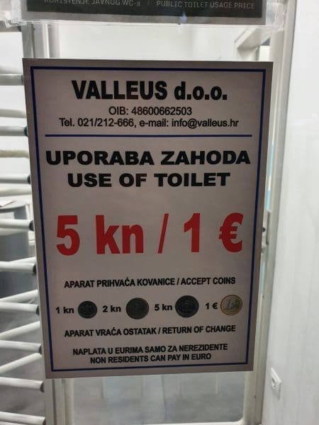 Naime, na vratima stoji da je cijena korištenja WC-a pet kuna, a u eurima je iznos jedan euro.