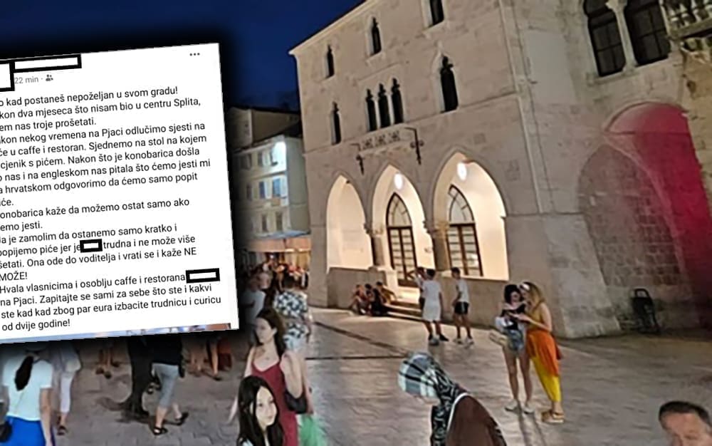 "Ono kad postaneš nepoželjan u svom gradu! Nakon dva mjeseca što nisam bio u centru Splita, odemo nas troje prošetati. Nakon nekog vremena na Pjaci odlučimo sjesti na piće u caffe i restoran. Sjednemo na stol na kojem je cjenik s pićem. Nakon što je konobarica došla do nas i na engleskom nas pitala što ćemo jesti, mi na hrvatskom odgovorimo da ćemo samo popiti piće. Konobarica kaže da možemo ostati samo ako ćemo jesti. Ja je zamolim da ostanemo samo kratko i popijemo piće jer je *** trudna i ne može više šetati. Ona ode do voditelja i vrati se i kaže "NE MOŽE!" Hvala vlasnicima i osoblju caffe i restorana na Pjaci. Zapitajte se sami za sebe što ste i kakvi ste kad zbog par eura izbacite trudnicu i curicu od dvije godine", napisao je na Facebooku.