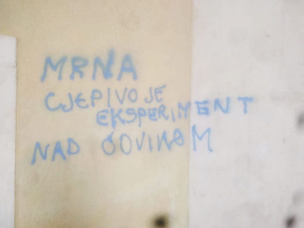 Kako doznajemo od naših čitatelja, natpisi, ili svojevrsni 'grafiti' osvanuli su na nekoliko lokacija, a njima se želi prenijeti negativna poruka o cjepivu za COVID-19 kao i o nošenju maski.