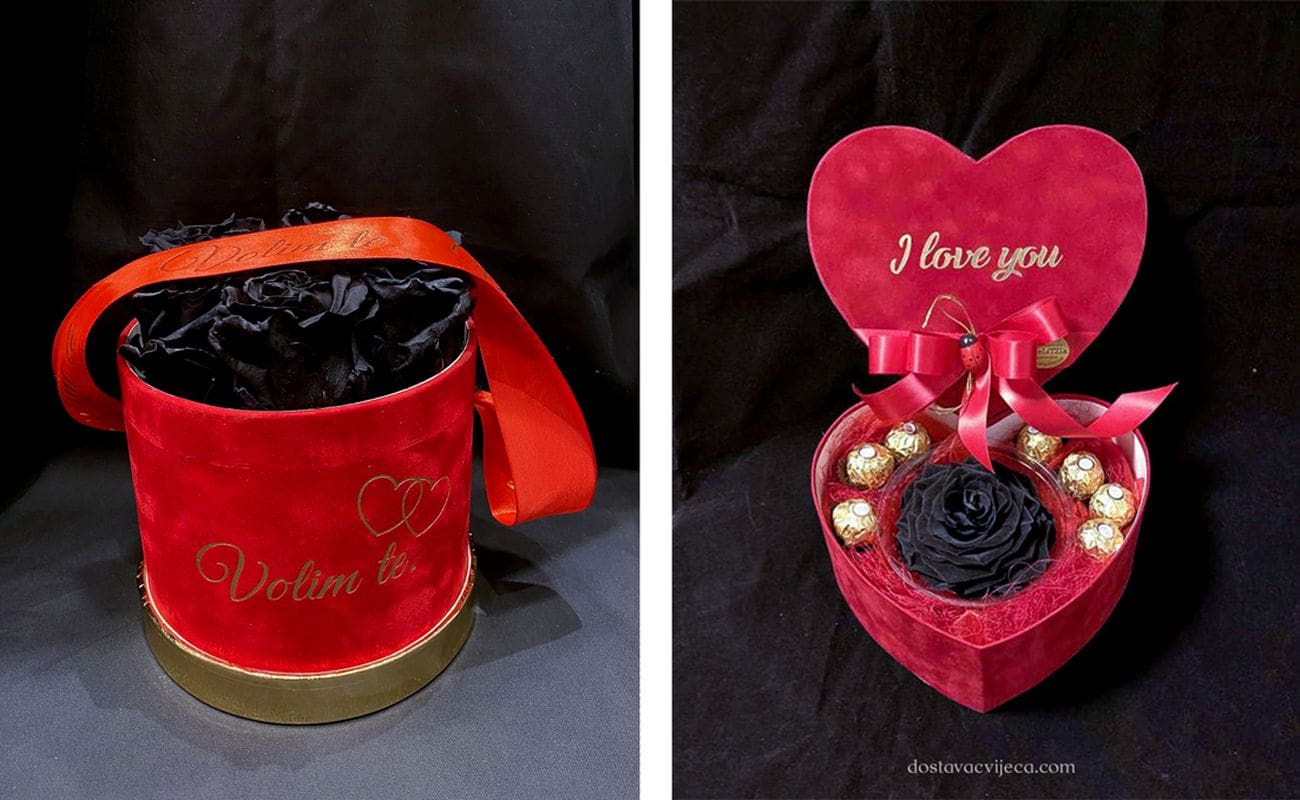Elegancija i profinjenost crnih prirodnih dugotrajnih ruža je za one drugačije, koji vole mističnost crne boje u obliku ruže. Mega crna ruža promjera cca 10 cm u crvenom baršun boxu je jedan od impozantnijih kreacija koja ostavlja bez daha.