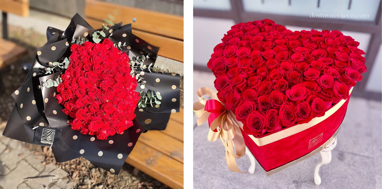 Kada je riječ o velikim romantičnim gestama, malo se stvari može usporediti s prekrasnom ljepotom 101 ruže. Ovaj luksuzni aranžman je ultimativni način izražavanja duboke ljubavi, strasti i odanosti. Bilo da je predstavljen kao raskošan buket ili u kutiji u obliku srca, poklon od 101 (i više) ruže ostavlja nezaboravan dojam.