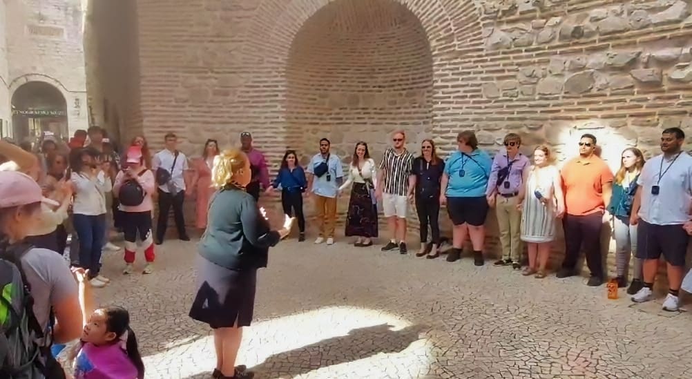Splitski novinar i turistički vodič Ivica Profaca danas je imao posebne goste . Naime, sa splitskim ljepotama i tradicijom upoznavao je je zbor Castle Singers iz američkog Wartburg College iz Iowe. Jedna od lokacija u staroj gradskoj jezgri kamo ih je odveo bila je Vestibul.