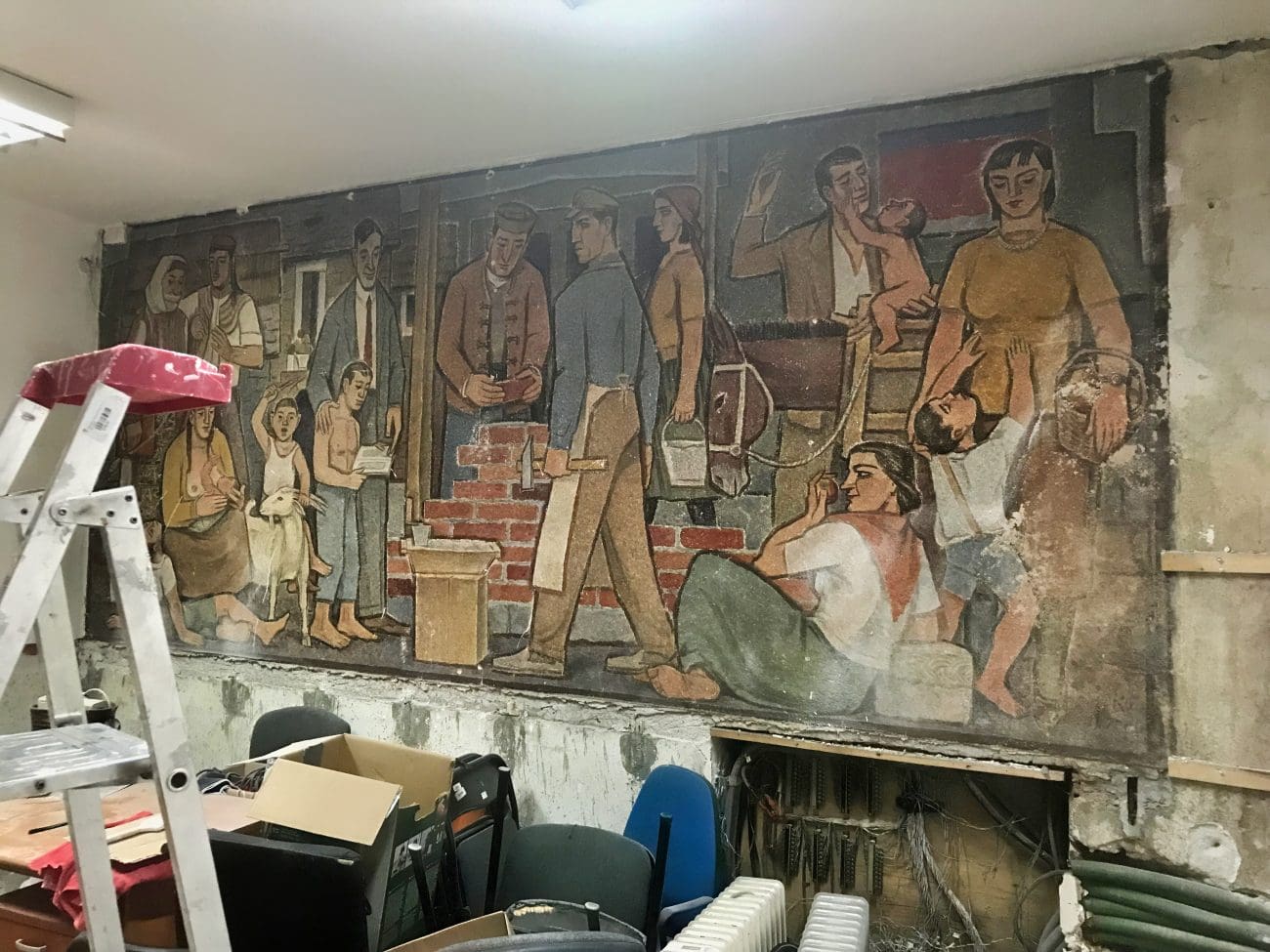 Freska je nastala u razdoblju nedugo nakon Drugog svjetskog rata i prikazuje motive seljaka i radnika u izgradnji poslijeratnog društva. Ovo umjetničko djelo predstavlja pravu rijetkost je u Dalmaciju, tek dvije slične freske u postoje u Dalmacija cementu, ali nisu ni blizu očuvane kao ova.