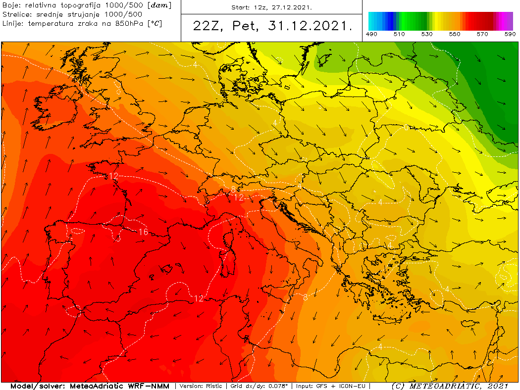 Od četvrtka do kraja tjedna pratit će nas slaba bura i postupno zatopljenje. Visoke temperature zraka donosi ogranak anticiklone s centrom oko zapadnog Sredozemlja, što je prilično atipična sinoptička situacija za kraj godine. Čini se da će najtoplije biti u petak i subotu, kada postoji mogućnost da u dijelovima Dalmacije padnu i neki temperaturni rekordi. Veća je vjerojatnost da se obore pojedini dnevni rekordi, no ne isključujemo mogućnost da se ponegdje sruše i apsolutni mjesečni rekordi.