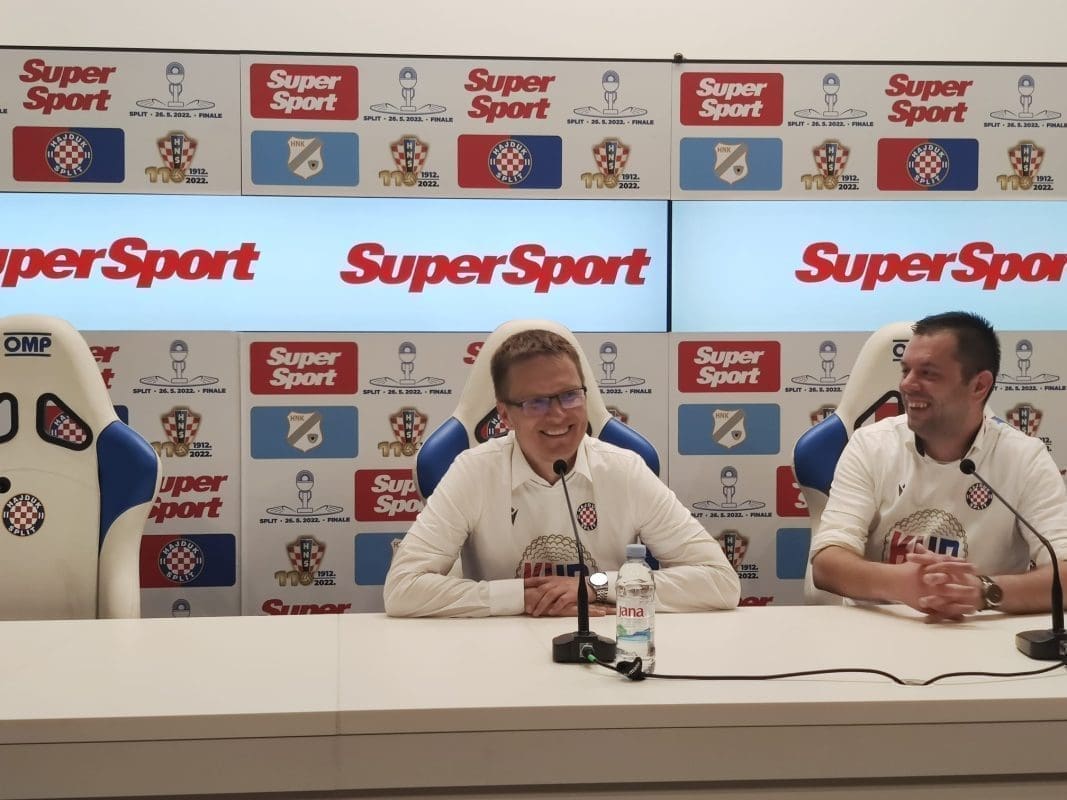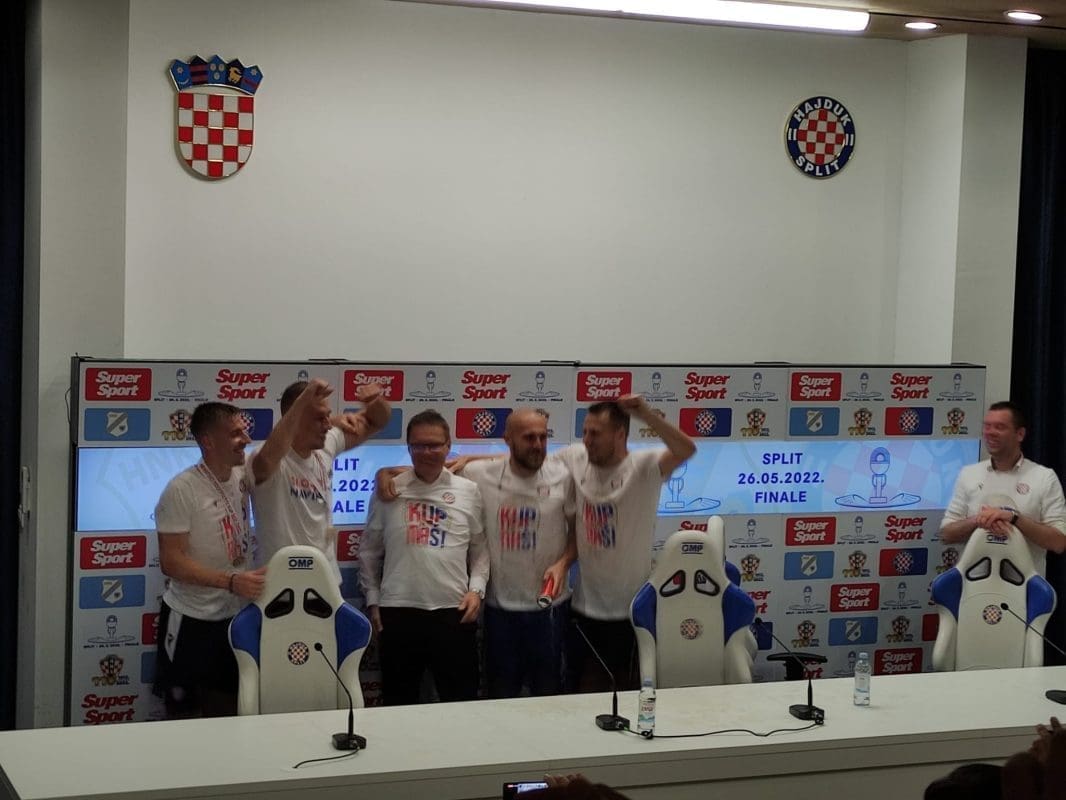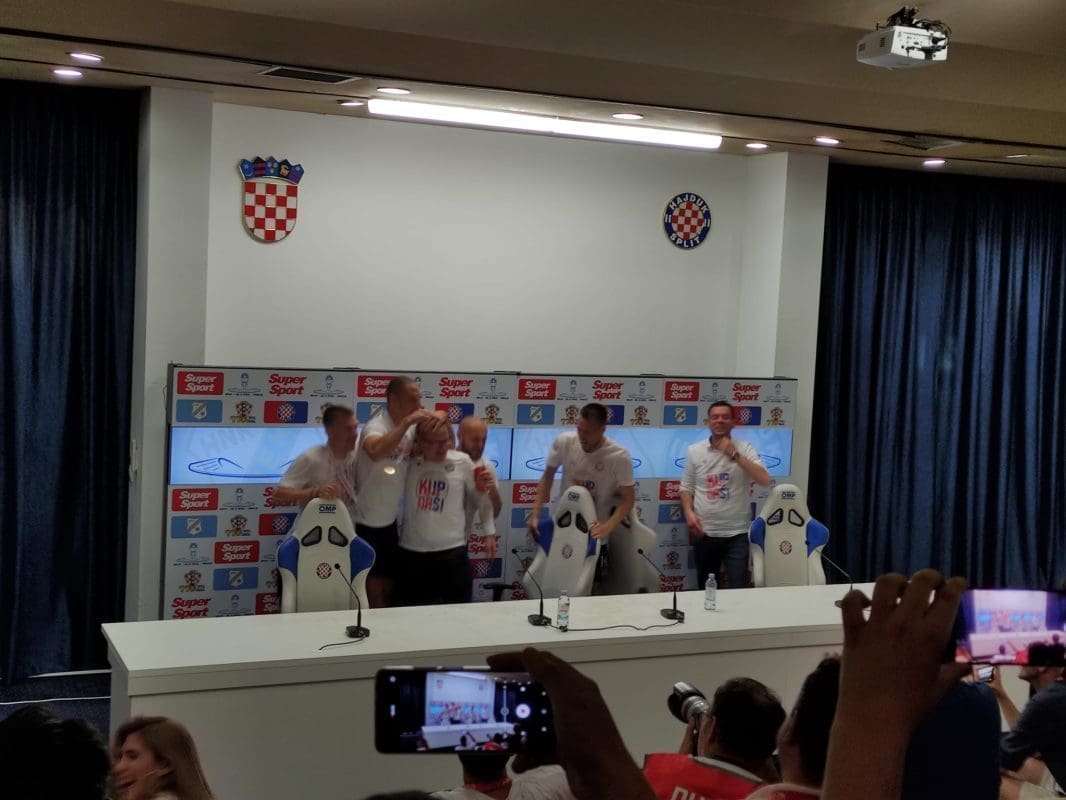 Veselo je bilo na konferenciji za medije nakon utakmice Hajduka i Rijeke. Nešto prije nešto što je počela presica, igrači su 'uletjeli' i i Valdasa Dambrauskasa su 'zalili' pivom...