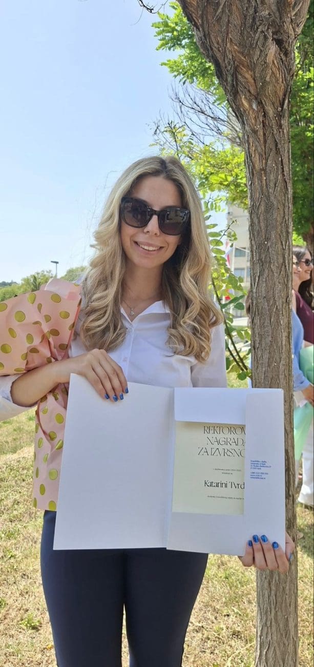 Za svoju izvrsnost je nagrađena Rektorovom nagradom koja joj puno znači i daje joj snažan vjetar u leđa za budući trud i rad u obrazovanju i životu općenito. Najviši prosjek njenih ocjena tijekom studiranja je bio visokih 4,9. Plan joj je da već ove godine nastavi obrazovanje na poslijediplomskom, odnosno doktorskom studiju kako bi stekla dublje znanje i postala doktorica znanosti.