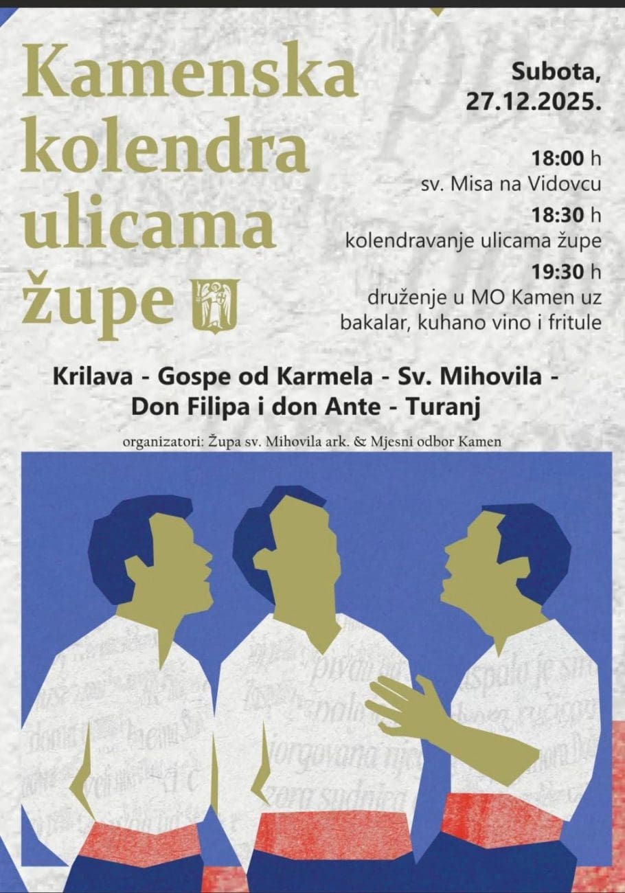 U subotu, 27. prosinca, u Kamenu će se održati Kamenska kolendra, događaj koji spaja tradiciju, vjeru i druženje. Program započinje svetom misom u 18 sati na Vidovcu, nakon koje će se u 18.30 sati zaputiti kolendravanje ulicama župe. Povorku će predvoditi Pučki pivači Kamen, uz sudjelovanje crkvenih zborova, a pjesma će se prolomiti Krilavom, ulicom Gospe od Karmela, ulicom sv. Mihovila, oko starog naselja sve do župne crkve.