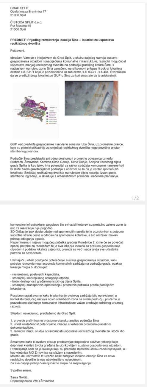– Slijedom svega navedenog, a nakon promišljanja stanovnika Žrnovnice, s čijim se stavom slažem kao legitimni predstavnik, zatraženo je da se novo reciklažno dvorište smjesti u Šinama – navodi Soldić.