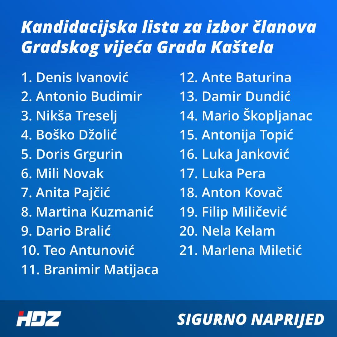 Na listi HDZ-a za Gradsko vijeće Grada Kaštela nalaze se brojni kandidati koji svojim dosadašnjim radom, stručnošću i angažmanom u zajednici, potvrđuju spremnost za preuzimanje odgovornosti u vođenju grada. Gradski odbor HDZ-a Kaštela istaknuo je kako je riječ o timu ljudi koji predstavlja spoj iskustva i svježih ideja – generacijski i profesionalno raznoliku skupinu povezanu zajedničkim ciljem: doprinositi razvoju Kaštela kroz odgovorno i stabilno upravljanje.