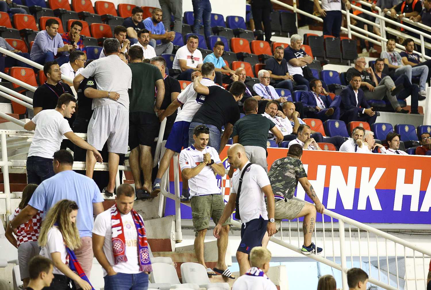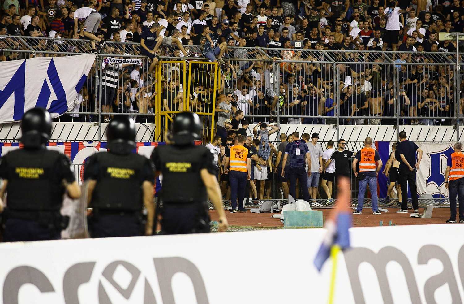 Dio navijača sa Zapada nasrnuo je prema svečanoj loži. Interventna policija je morala napraviti koridor ispod zapadne tribine.