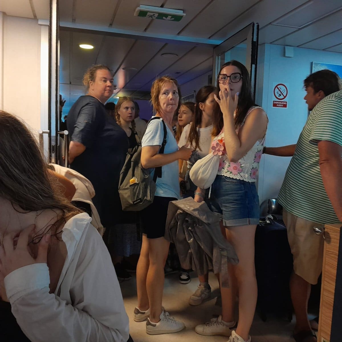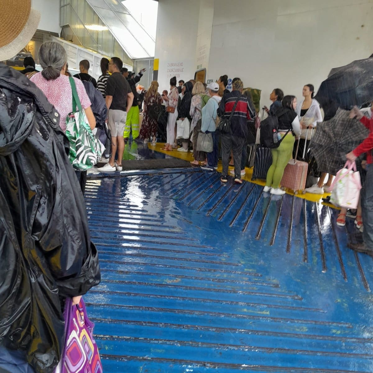 Kaže da je na trajektu nevjerojatna gužva. Naravno da se trajekti ne nalaze jedan pored drugog, zato su ljudi i pokisli u tolikoj mjeri.