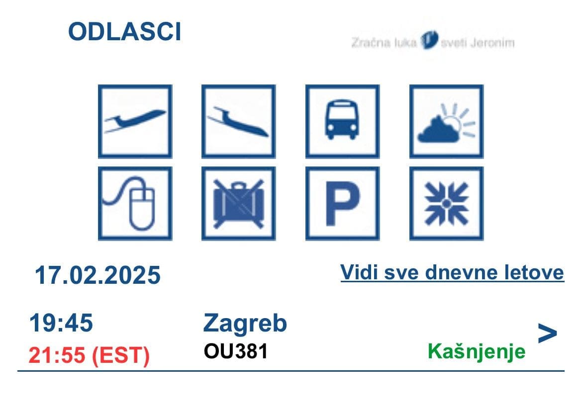 Avion na letu OU381 iz Splita za Zagreb koji je trebao poletjeti večeras u 19:45 kasnio je više od dva sata. Na službenim stranicama aerodroma stoji da je let kasni, a avion je poletio u 21:55.