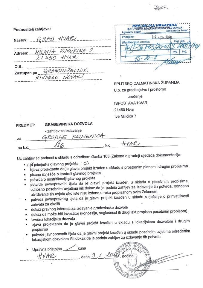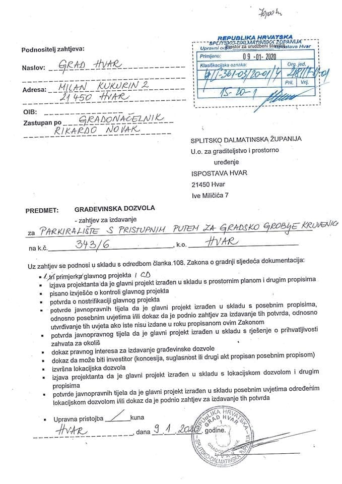 Grad Hvar predao je jučer hvarskoj ispostavi Upravnog odjela za graditeljstvo i prostorno uređenje Splitsko-dalmatinske županije zahtjev za izdavanje građevinske dozvole za groblje Kruvenica te zahtjev za izdavanje građevinske dozvole za parkiralište s pristupnim putem za gradsko groblje Kruvenica.