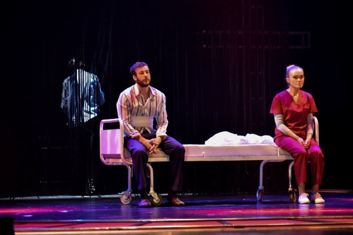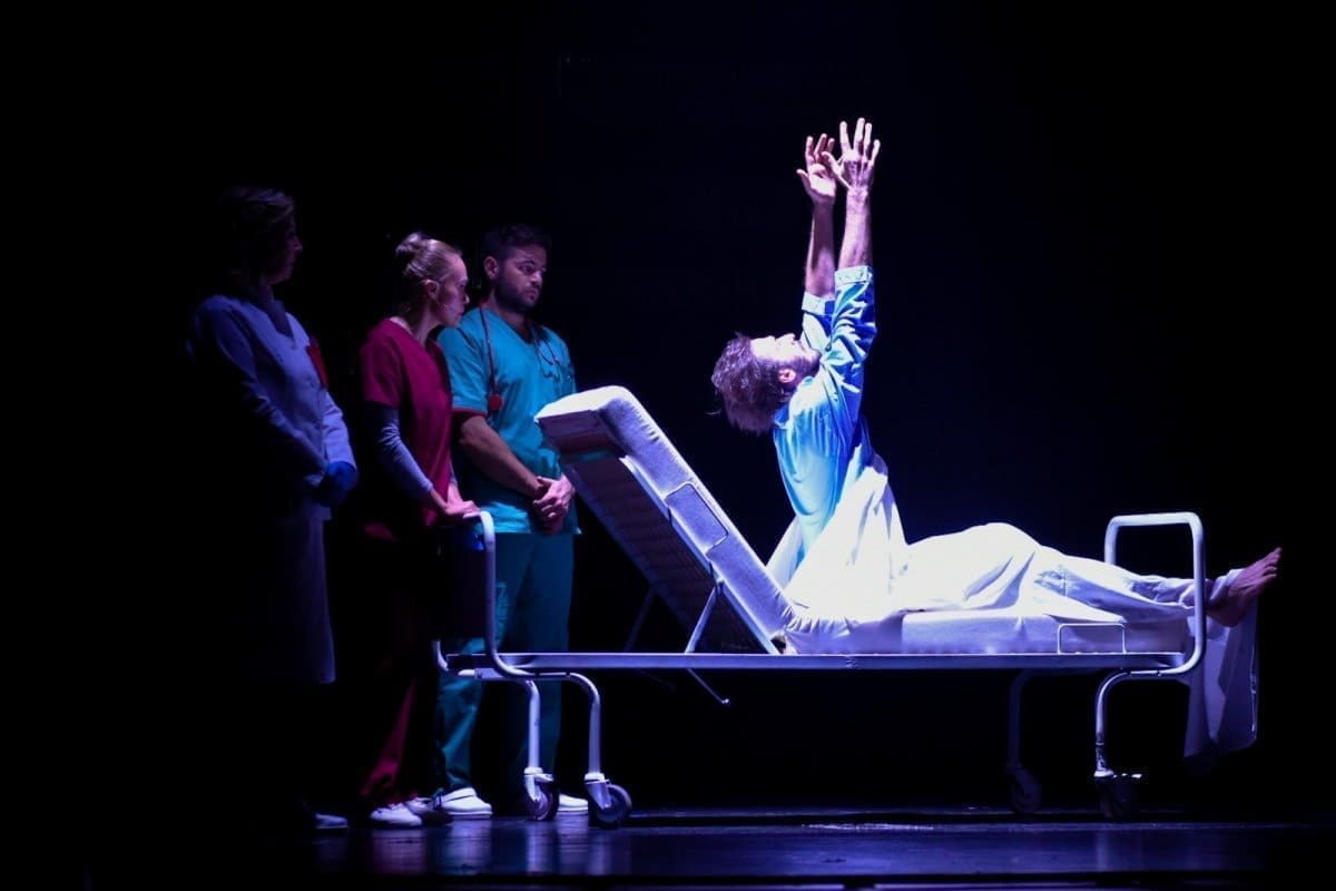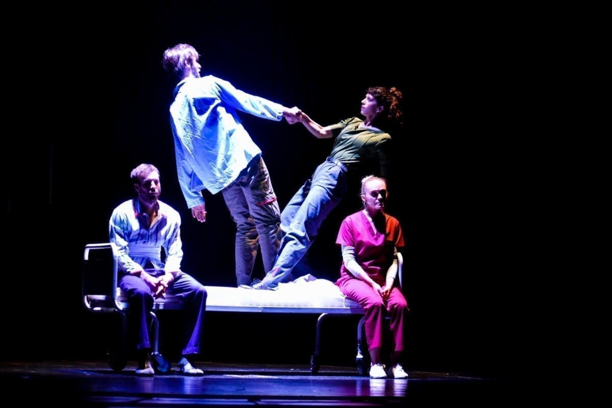 Sjajan glumački ansambl ove predstave čine Mijo Jurišić (Damir), Petra Kovačić Botić (Mitra), Ana Marija Veselčić (Malena), Nenad Srdelić (Djed), Arijana Čulina (Baka), Tajana Jovanović (Liječnica, Policajka, Žena), Pere Eranović (Liječnik, Inspektor), Anastasija Jankovska (Medicinska sestra), Filip Radoš (Susjed) i Luka Čerjan (Pacijent). „Okretište“ je knjiški primjer savršena kastinga. Jurišić je stupio na pozornicu i nije glumio Damira – on je bio Damir. Ranjeni genijalac, tempirana bomba, hodajuća emocija, čovjek koji vas stavlja u opasnu dilemu dok govori „Živ sam i dobro mi je. Život se vraća u normalu.“ Ne znate je li odlučan ili ironičan. I u toj aporiji leži ljepota. Sjajna Petra Kovačić Botić donosi eksploziju emocija kao zabrinuta i ogorčena Mitra, žena-stup koja mora stajati uspravno da se svijet ne sruši, da Malena (u izvrsnoj, uvjerljivoj i dirljivoj interpretaciji koju je pružila Ana Marija Veselčić) nastavi vjerovati u ljude.