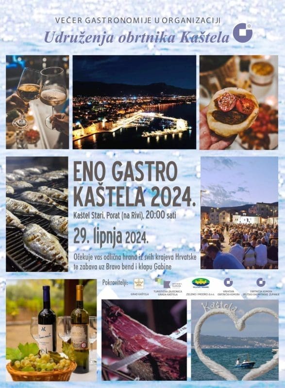 Udruženje obrtnika Kaštela uz pokroviteljstvo Grada Kaštela, TZ Grada Kaštela, tvrtke Zeleno i modro d.o.o., Hrvatske obrtničke komore i Obrtničke komore Splitsko-dalmatinske županije 29. lipnja 2024. godine organizira manifestaciju ENO GASTRO KAŠTELA 2024.