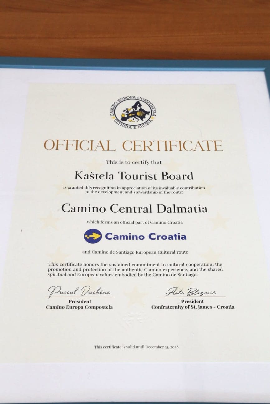 U prostorima Gradske uprave Grada Kaštela svečano je uručen certifikat Camino Kaštela, kojim je grad Kaštela i službeno postao dio europske Camino obitelji.