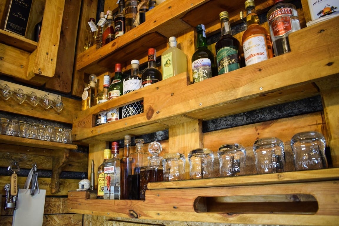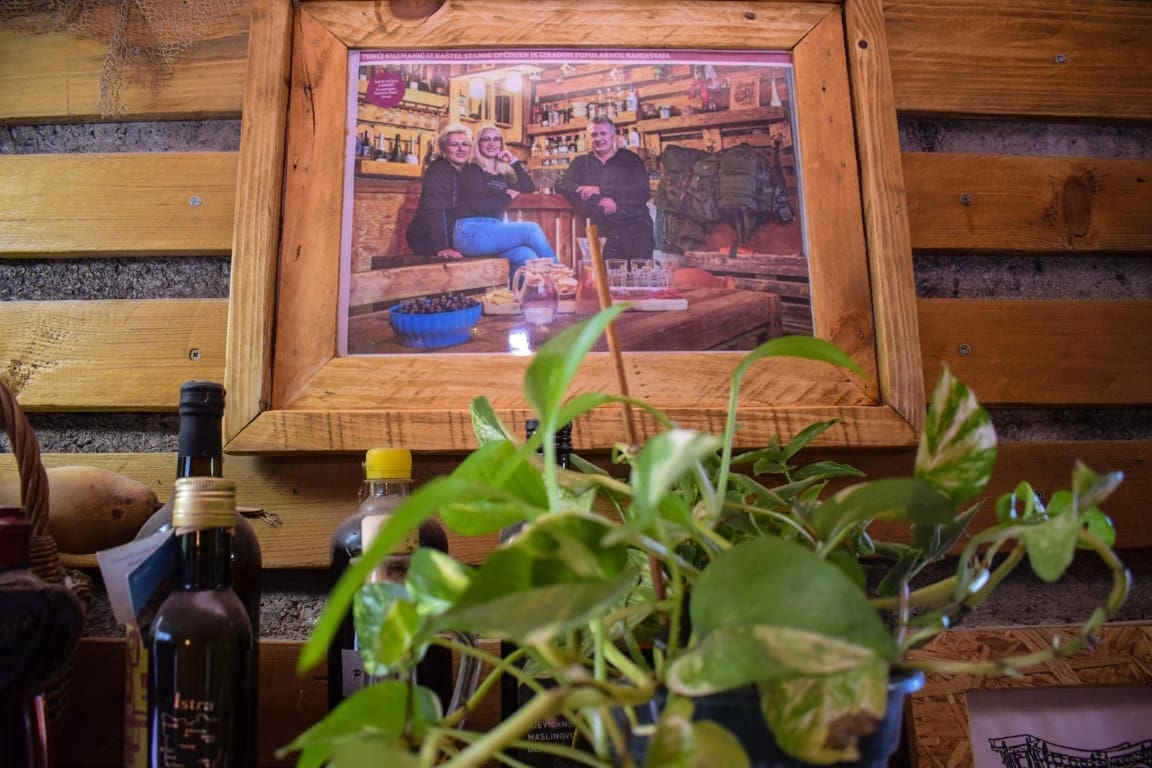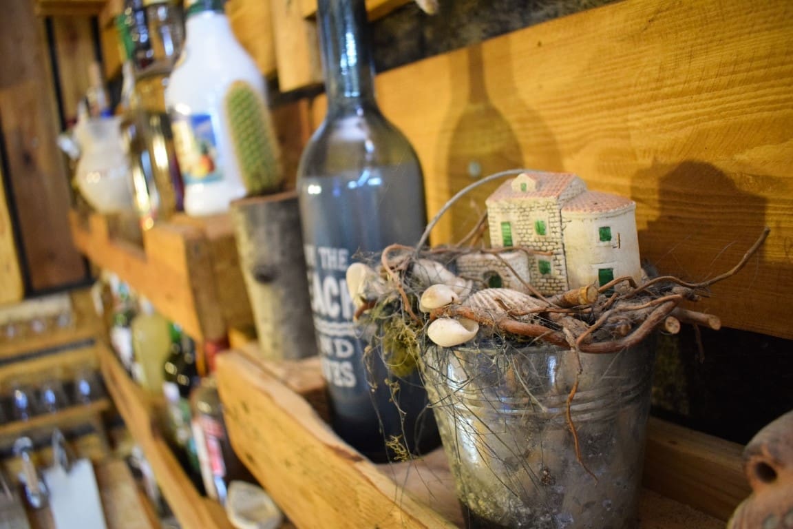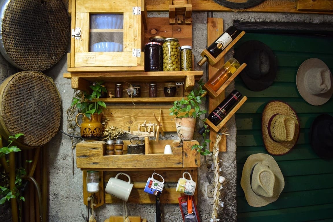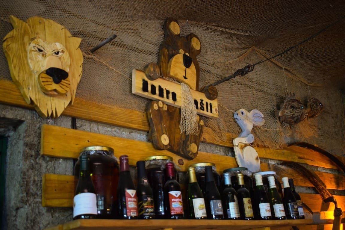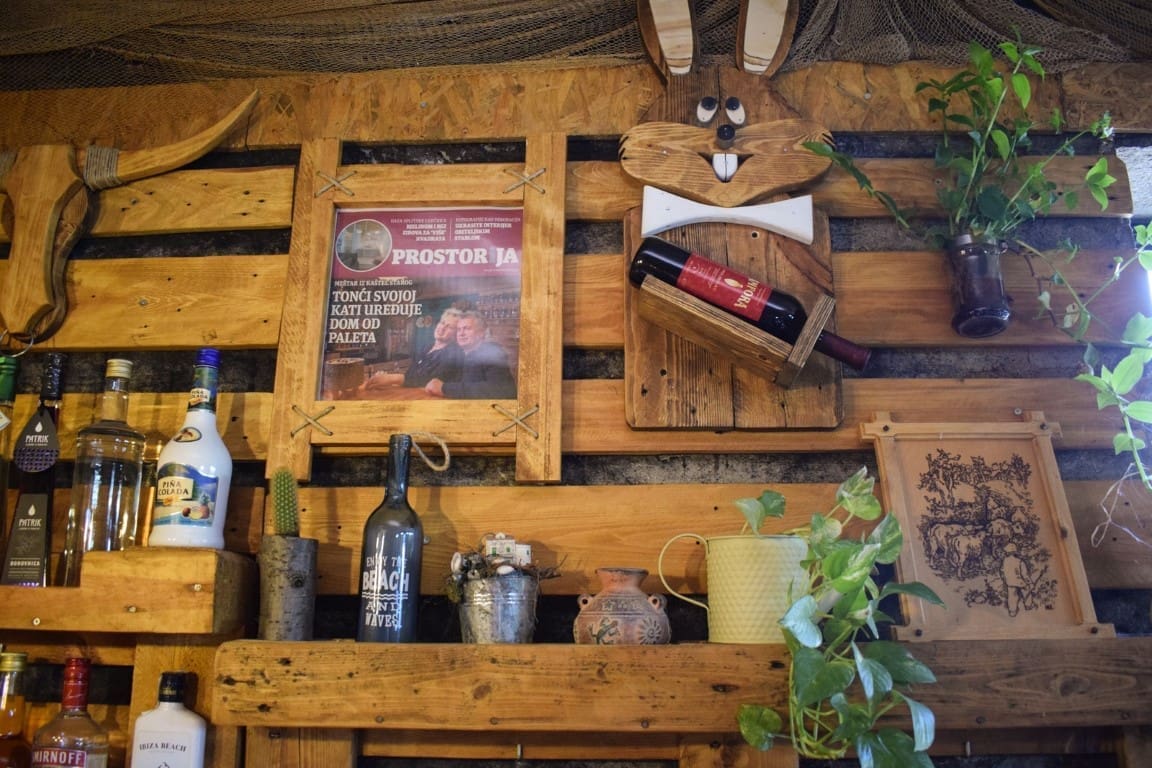 Što je konoba bez šanka vjerojatno se i Tonći zapitao kad je došao na ideju napraviti šank od paleta i barske stolice. Kako je supruga Kata iz ribarske obitelji, ribe izrađene od paleta postale su neizostavan detalj koji je dao jedan poseban štih ovoj konobi. Naravno, bilo je potrebno napraviti i sve vitrine na koje je domaćica mogla pospremiti svoje delicije koje priprema. Tu su i stalci za vino i razne rakije koje također rade sami.