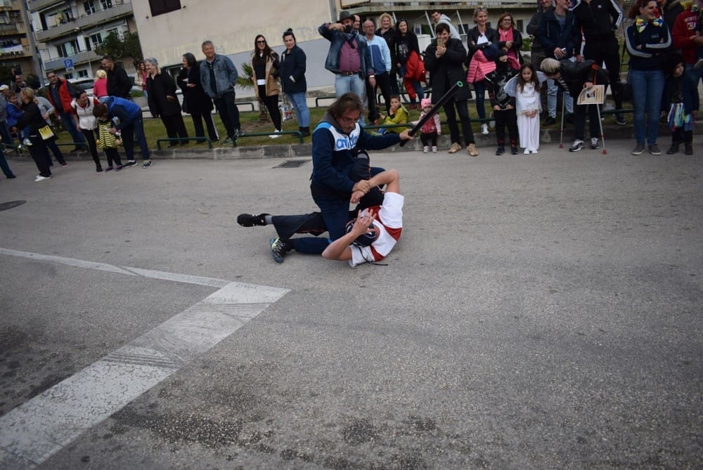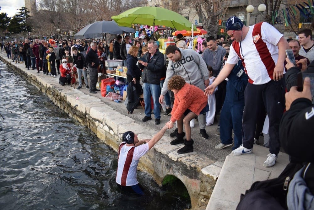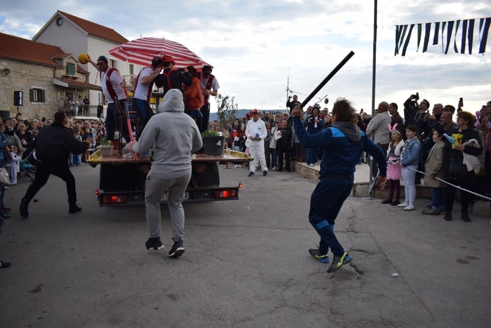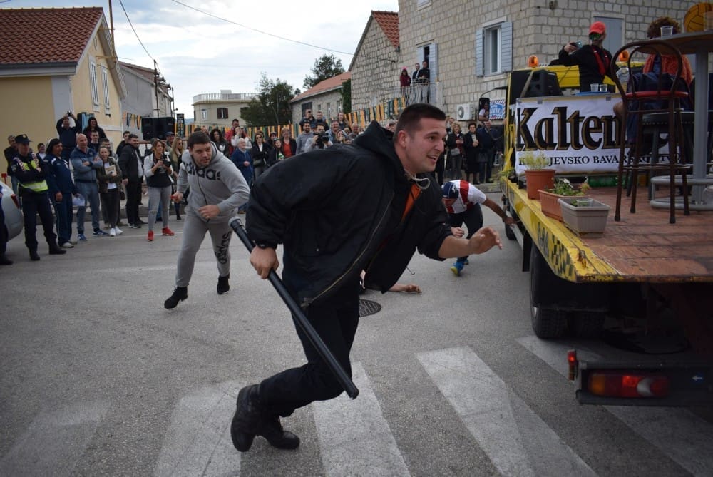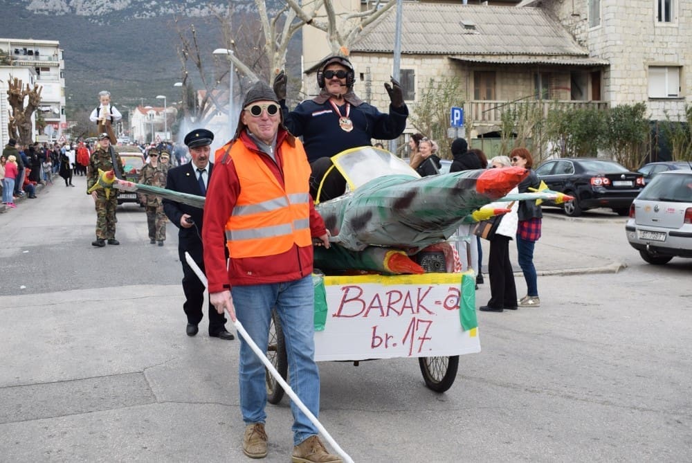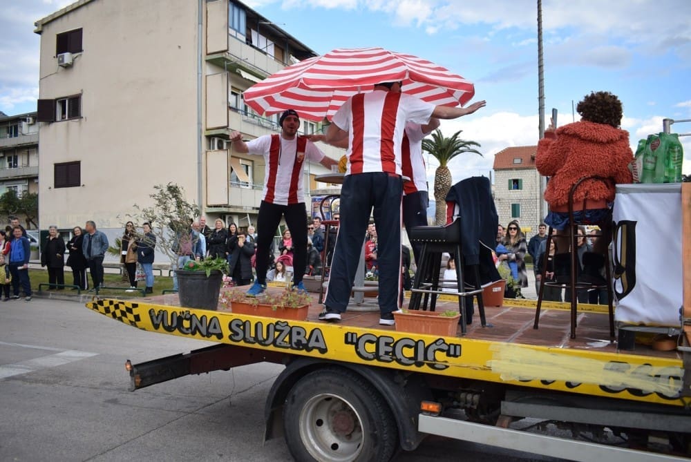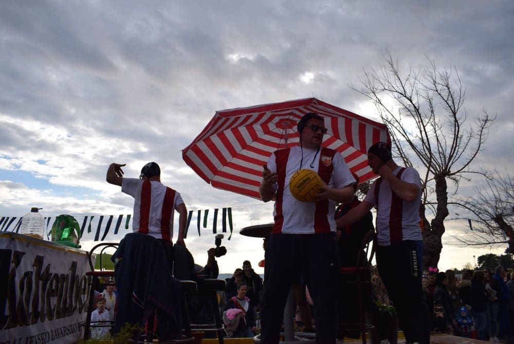 Vrijeme od maškara je jedno od najveselijih u Kaštelima, a u drugu ruku i vrijeme u kojem se ismijava sve i svašta. Tako su u svojoj sljedećoj točki prikazali nemili događaj koji se nedavno dogodio u Splitu, gdje je vaterpolist Crvene Zvezde skočio u more. Kroz povorku kretao se tamić sa Zvezdinim obilježjima, na kojem su bili ”srpski” vaterpolisti. U jednom trenutku uslijedio je napad šipkama te je jedan od ” vaterpolista” skočio u more. Nakon skoka u more jedna cura mu je dala ruku i pomogla izaći. Bilo je u povorci i doktora s lažnim diplomama, borbenih aviona, malih crnaca, slikara te mnogih drugih.
