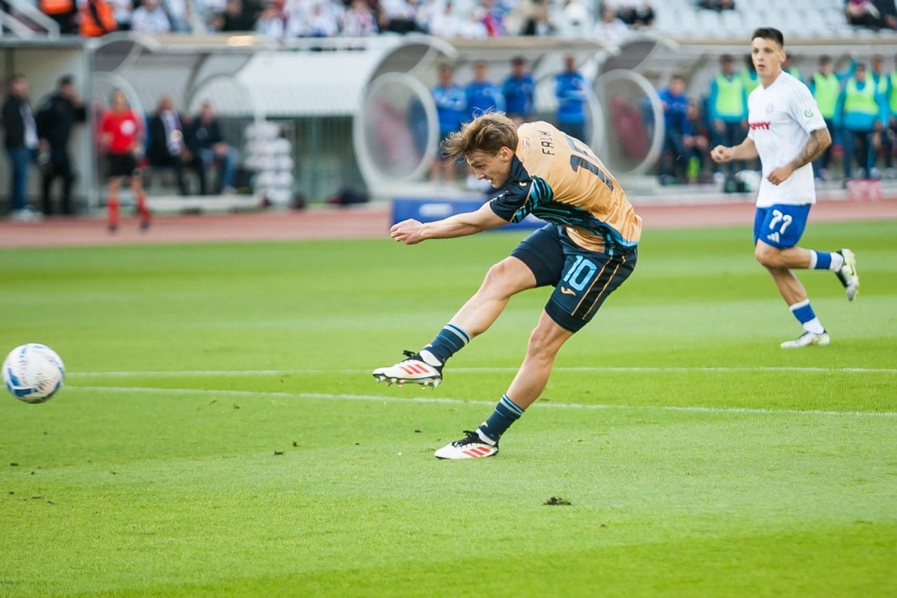 Strijelac je za Rijeku u 5., 22. i 32. minuti. Posebno se istaknuo drugi pogodak: Fruk je presjekao dodavanje Šarlije na otprilike 25–30 metara od gola, izbacio Hodaka iz igre i precizno pogodio s vrha šesnaesterca za povećanje vodstva.