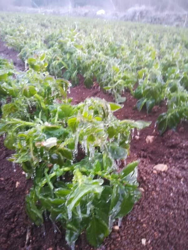 Iz Vrgorca nam danas stižu fotografije iz tamošnjeg polja gdje su ljudi pokušali zaštititi mlade krumpire i jagode vodenim prskalicama, no temperatura je bila toliko niska da se i voda zaledila na biljkama.