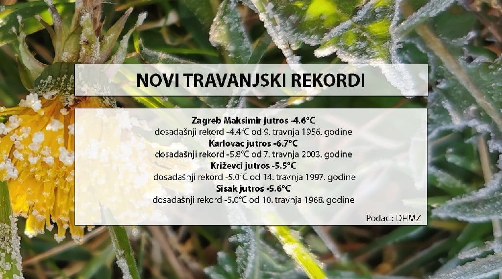 Cijela zemlja danas uživa u sunčanom vremenu, no noć i jutro za nama ostat će upamćeno kao jedno od najhladnijih travanjskih jutara od početka službenih meteoroloških mjerenja. Primjerice najniže travanjske temperature zraka od početka službenih mjerenja zabilježene su u Zagrebu, Maksimir (-4,6°C), Karlovcu (-6,7°C), Križevcima (-5,5°C), Sisku (-5,6°C), Varaždinu (-6,4°C). Radi se službenim podacima DHMZ-a.