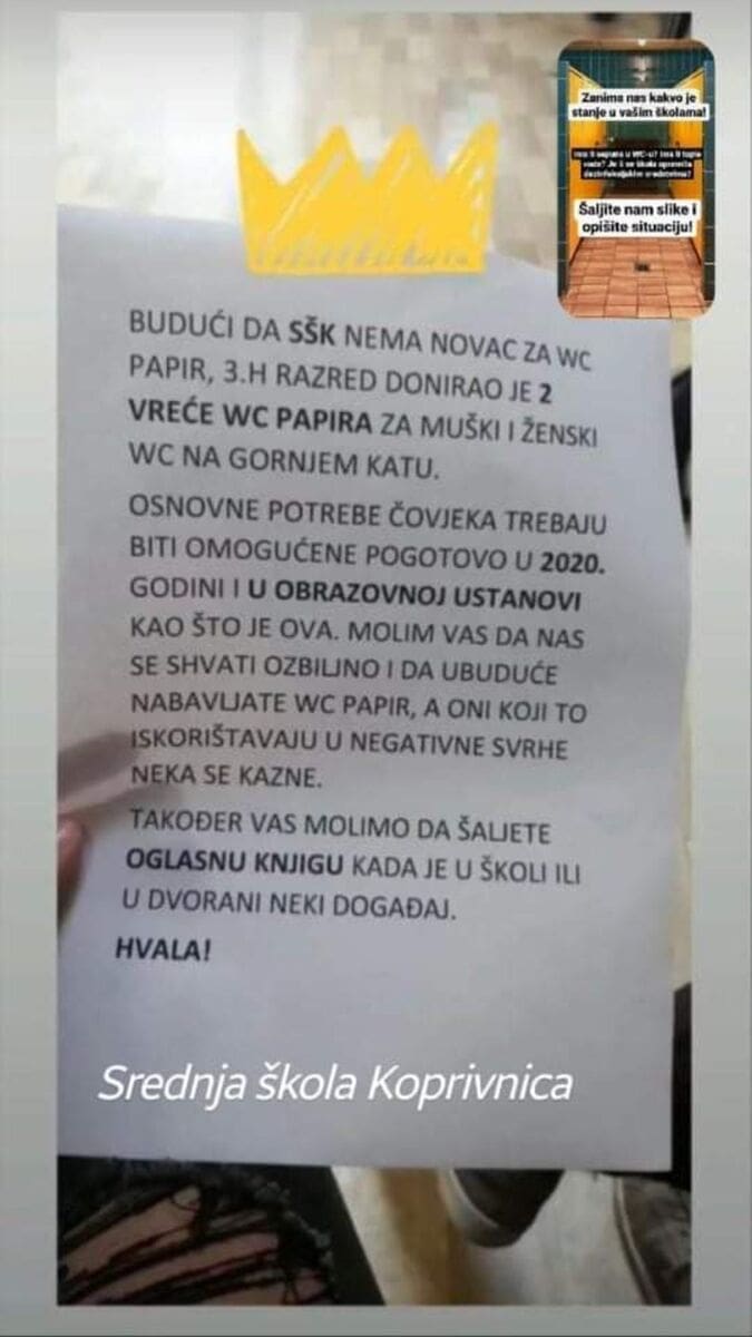 U najmanju ruku zanimljivom mogla bi se opisati i situacija koja se odigrala u Srednjoj školi Koprivnica. Kako u školi nije bilo WC papira, jedan je razred odlučio kupiti dvije vreće za WC na katu uz sljedeću poruku vodstvu škole: