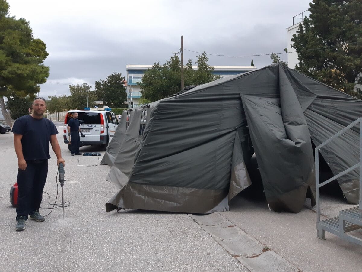 Pripadnici Državne intervencijske postrojbe civilne zaštite Službe Split tijekom ponedjeljka postavili su novi šator u blizini Plućnog odjela KBC-a Split.