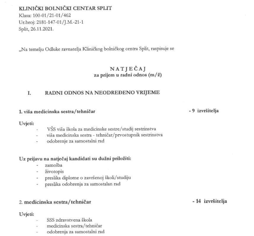 KBC Split stalno objavljuje natječaje za radna mjesta medicinskih sestara i to najčešće za stalni radni odnos. U vrijeme kad su granice EU otvorene za radnu snagu iz Hrvatske imamo doslovno bijeg medicinskog osoblja. Višestruko veća plaća glavni je motiv.