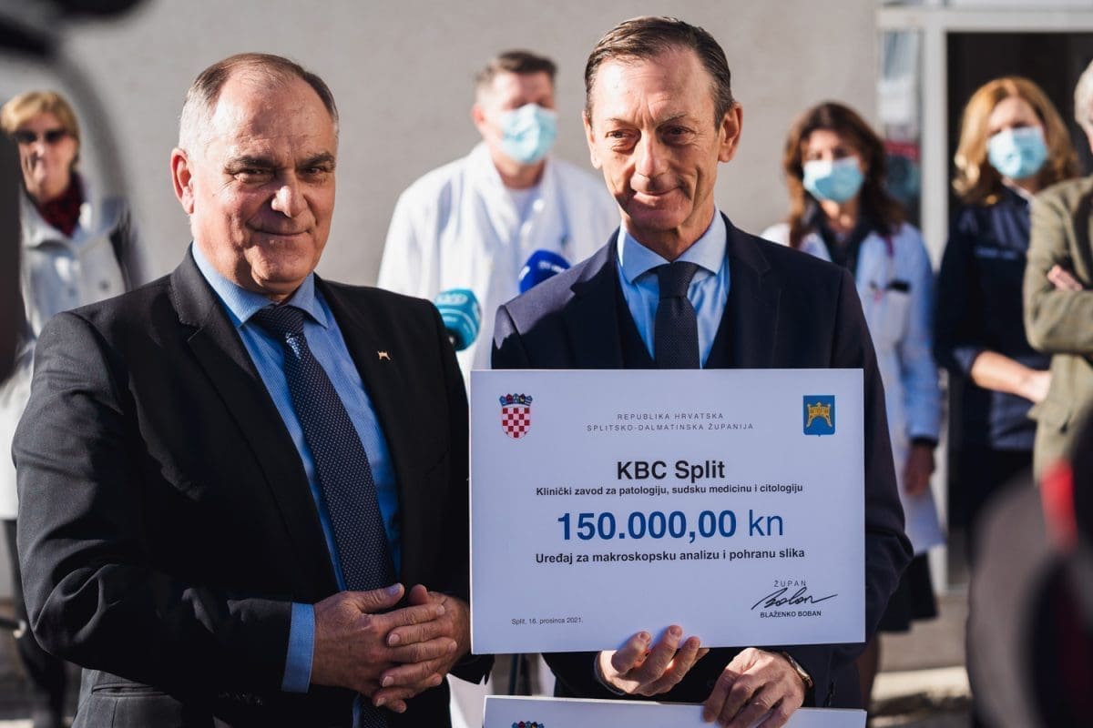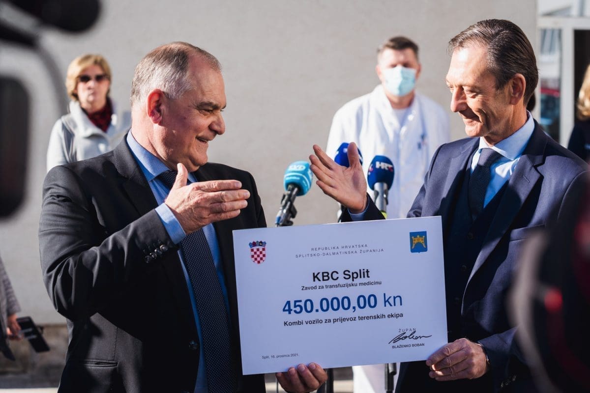Splitsko-dalmatinski župan Blaženko Boban uručio je ravnatelju KBC-a Split prof.dr.sc. prim. Juliju Meštroviću donaciju u visini od 600 tisuća kuna. Od tog iznosa 450 tisuća namijenjeno je Zavodu za transfuzijsku medicinu i to za kombi vozilo za prijevoz terenskih ekipa za uzimanje krvi od dobrovoljnih davatelja, a 150 tisuća ide Kliničkom zavodu za patologiju, sudsku medicinu i citologiju za uređaj za makroskopsku analizu i pohranu slika radi kvalitetnije dijagnostike.