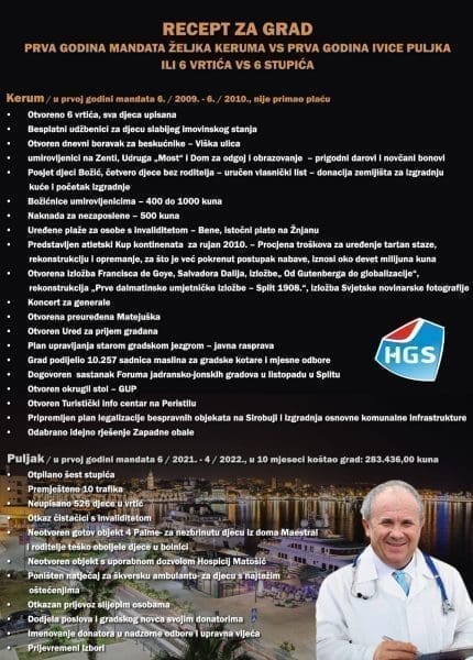 Gradonačelnički kandidat i nekadašnji splitski gradonačelnik Željko Kerum objavio je plakat na kojem je nabrojao stavke što je napravio u svojoj prvoj godini mandata od lipnja 2009. do lipnja 2010.