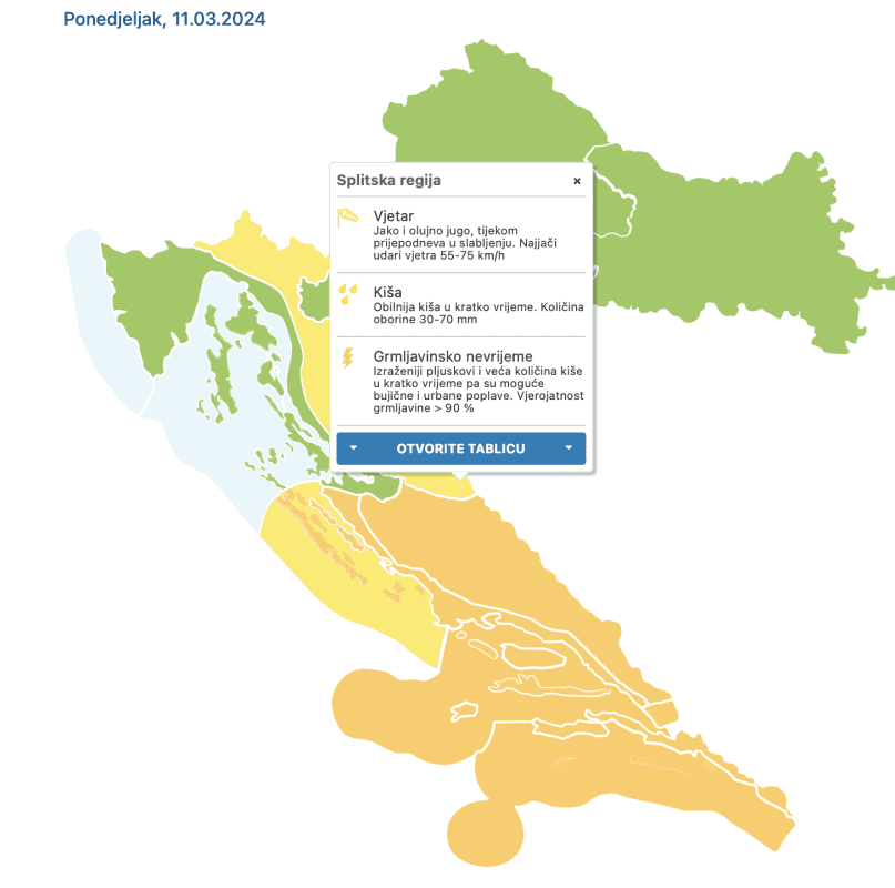 DHMZ je unutar sustava MeteoAlarm izdao narančasti stupanj upozorenja za gotovo cijelu Dalmaciju. Tako meteorolozi predviđaju preko 80 litara kiše po metru kvadratnom, olujni vjetar i grmljavinsko nevrijeme.