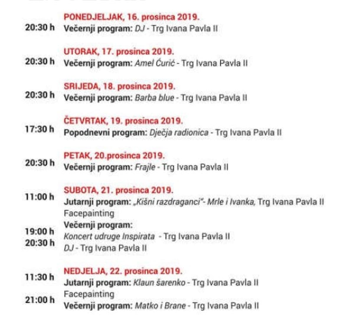 U nedjelju, 22. prosinca na Trgu Ivana Pavla II nastupit će Klaun Šarenko uz prigodan facepainting. Istoga dana navečer od 21 sat očekuje vas nastup Matka i Brane.
