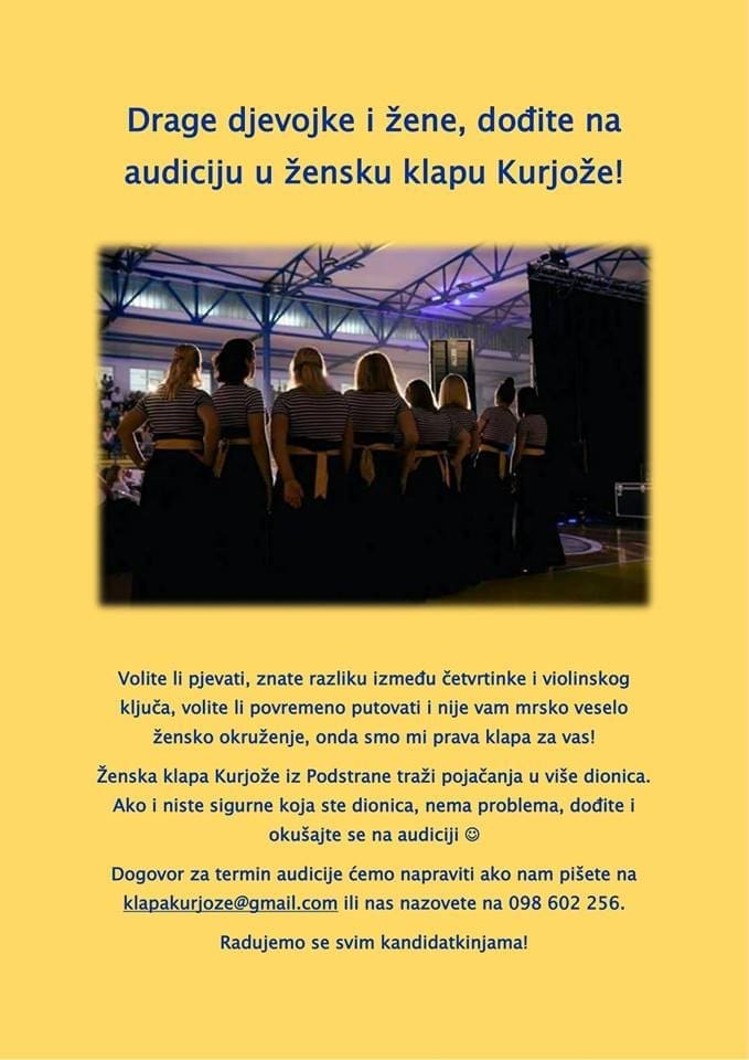 - Ženska klapa Kurjože je u potrazi za novim glasovima! Ako ste zainteresirane za pjevanje u ženskoj klapi, ali niste sigurne koja ste dionica, svakako nam se javite da dogovorimo audiciju i pomognemo vam otkriti jeste li buduća podržavateljica terce ili ste više za altovska bojanja akorda, rekli su iz klape Kurjože.