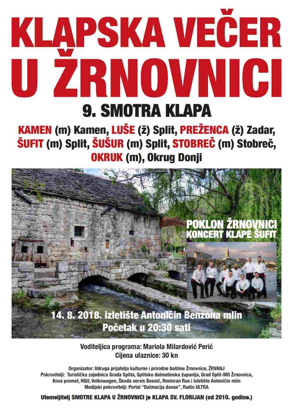 Deveta smotra klapa u Žrnovnici dogodit će se uoči blagdana Velike Gospe, u utorak (14. kolovoza) s početkom u 20:30. Novost ovogodišnjeg klapskog događaja je da nakon smotre slijedi samostalni koncert klape Šufit. Cijena ulaznica je 30 kuna.