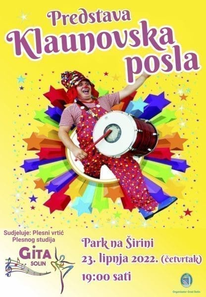 Povodom završetka školske godine, 𝘂 č𝗲𝘁𝘃𝗿𝘁𝗮𝗸, 𝟮𝟯. 𝗹𝗶𝗽𝗻𝗷𝗮 𝟮𝟬𝟮𝟮. 𝗴𝗼𝗱𝗶𝗻𝗲 𝘂 𝗽𝗮𝗿𝗸𝘂 𝗻𝗮 Š𝗶𝗿𝗶𝗻𝗶, održat će se zabavna predstava klauna Srećka pod nazivom "𝗞𝗹𝗮𝘂𝗻𝗼𝘃𝘀𝗸𝗮 𝗽𝗼𝘀𝗹𝗮".