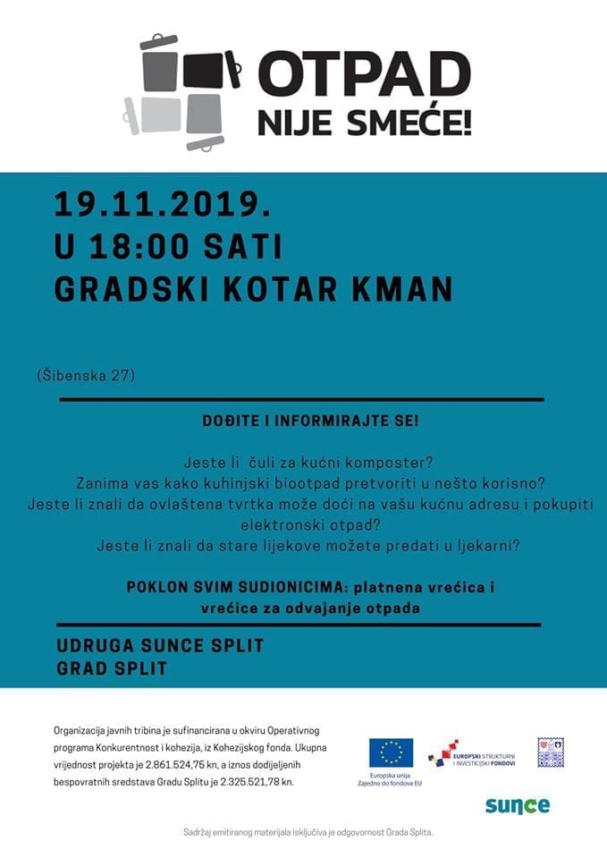 "Jeste li čuli za kućni komposter? Zanima vas kako kuhinjski biootpad pretvoriti u nešto korisno? Jeste li znali da ovlaštena tvrtka može doći na vašu kućnu adresu i pokupiti elektronski otpad? Jeste li znali da stare lijekove možete predati u ljekarni?" - samo su neka pitanja na čije ćete odgovore moći čuti na edukaciji o odvajanju otpada koja će se u utorak (19.11.) s početkom u 18 sati održati u prostorijama GK Kman (Šibenska 27, Split).