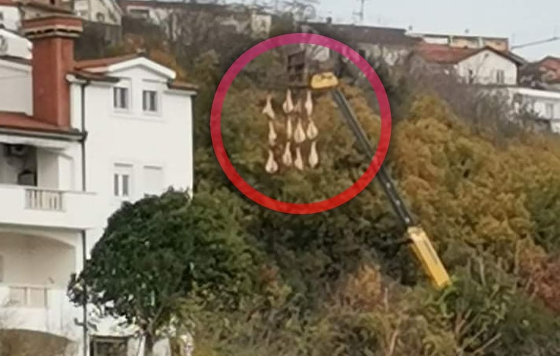 Iskoristila je to jedna obitelj iz Imotskog i to na iznimni zanimljiv način. Kako se može vidjeti na fotografiji koju je objavila satirična Facebook stranica Dnevna doza splitskog nereda, čak dvanaest pršuta objesili su o dizalicu, visoko iznad tla.