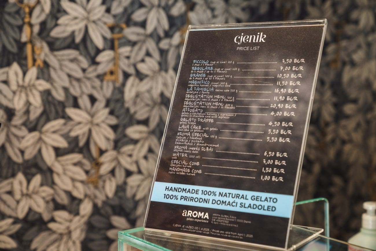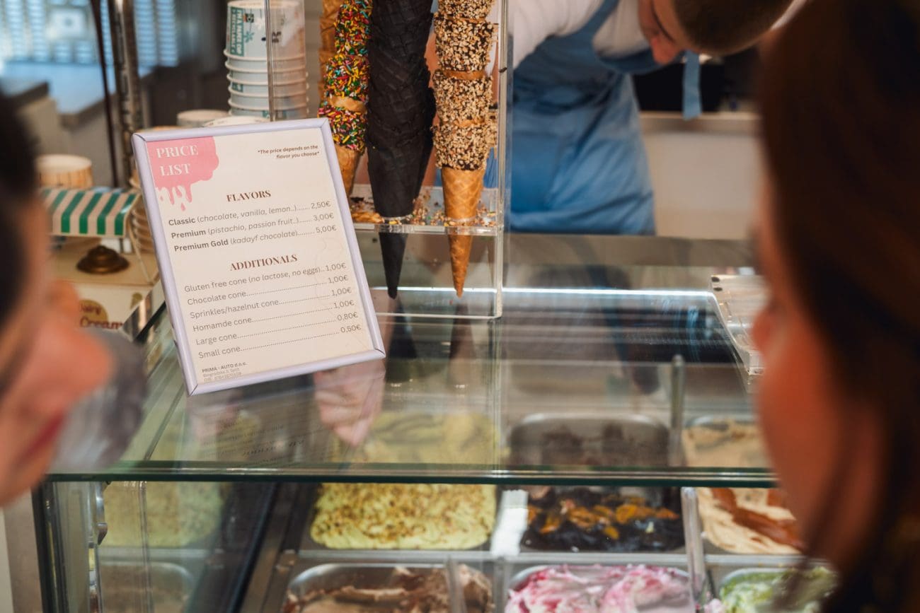 Cijena klasične kuglice ovdje iznosi 2,50 eura, dok za premium okuse treba izdvojiti tri eura. Ako se odlučite za tzv. gold premium varijante, cijena doseže i do 5 eura. Posebnu pažnju privlači njihov luksuzni okus Dubai čokolada s jagodom, za koji je potrebno izdvojiti 6,50 eura, a svaki dodatak naplaćuje se još 0,50 eura.