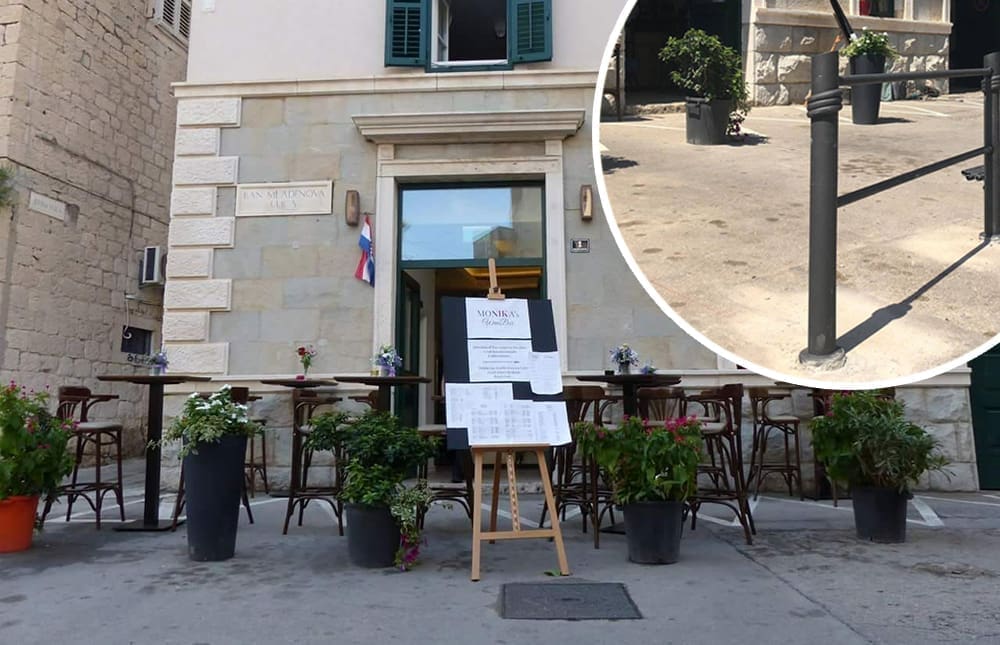 S obzirom da je ugostiteljski objekt "Monika's wine bar" dan prije postavljanja ograde izbacio štekat, čime je ograničio prolaz pješacima i doveo ih u opasnost od prometa, Gradu smo uputili i upit imaju li koncesiju za njega. Odgovor na ovo i druga pitanja vezana uz ovaj, malo je reći neobičan slučaj, nismo dobili do objave, a kad stignu svakako ćemo ih objaviti.