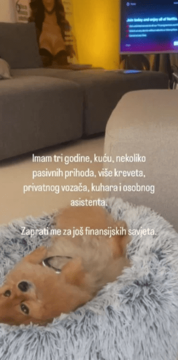 "Imam tri godine, nekoliko pasivnih prihoda, više kreveta, privatnog vozača, kuhara i osobnog asistenta. Zaprati me za još financijskih savjeta", napisala je uz fotografiju.